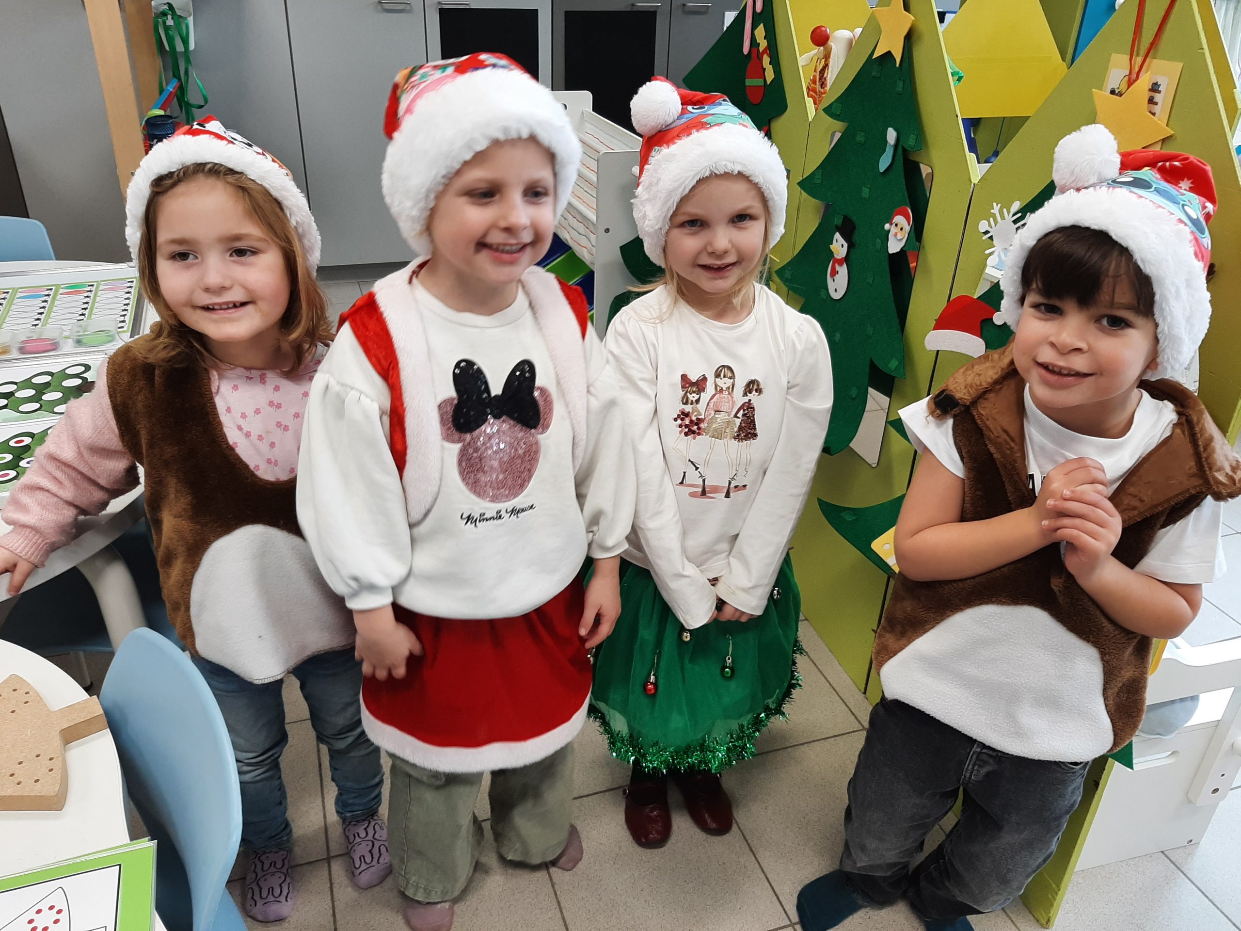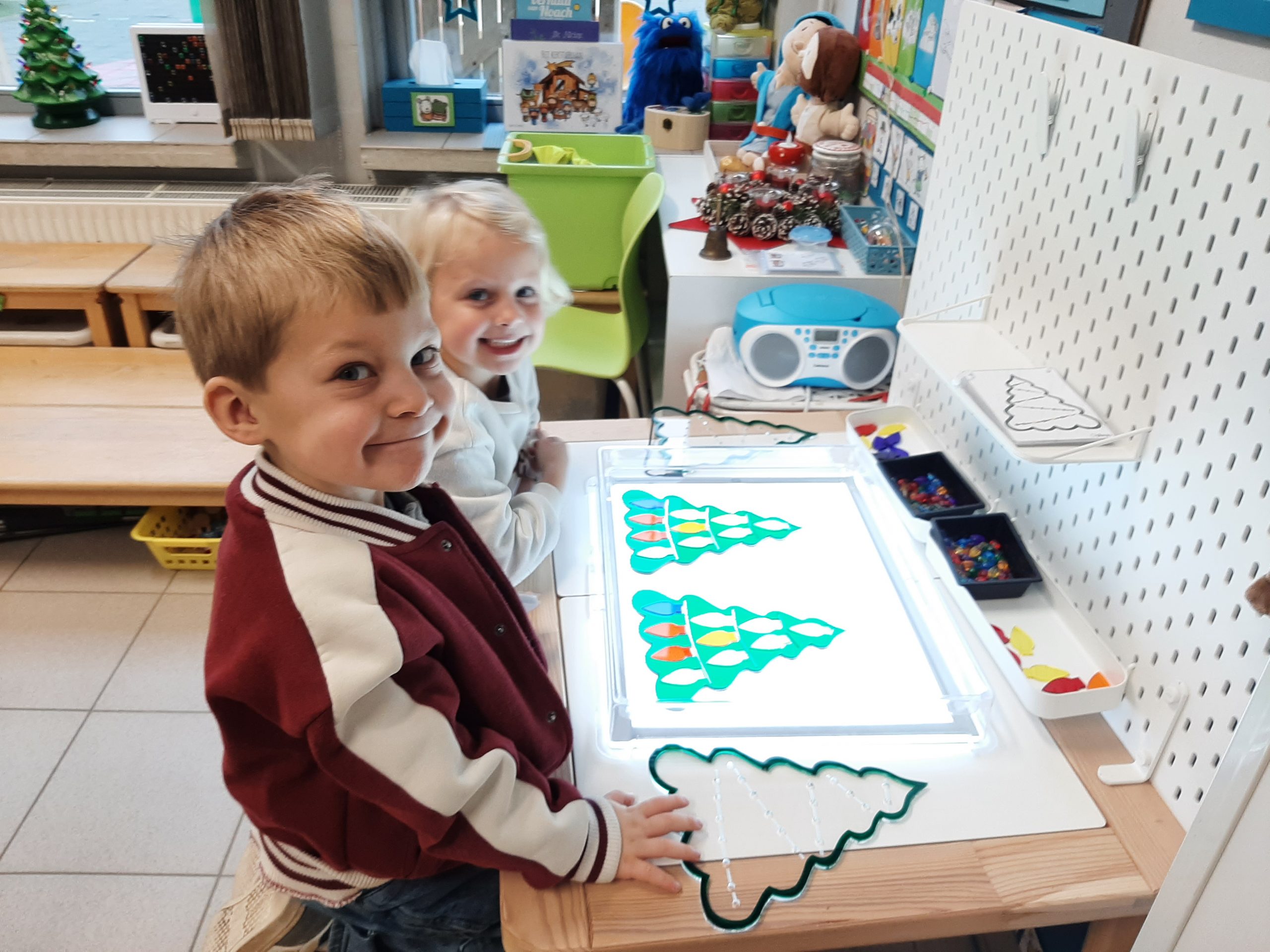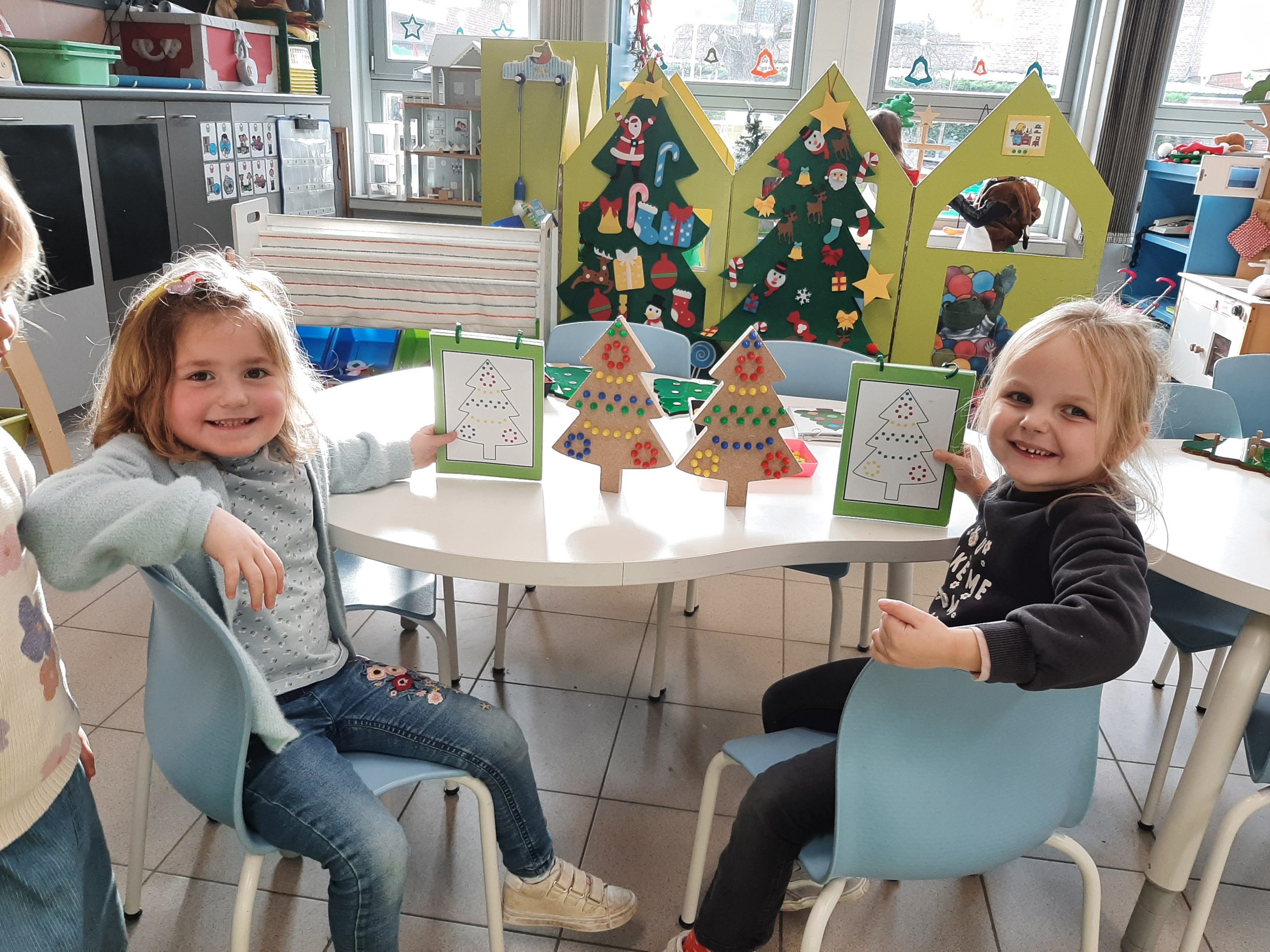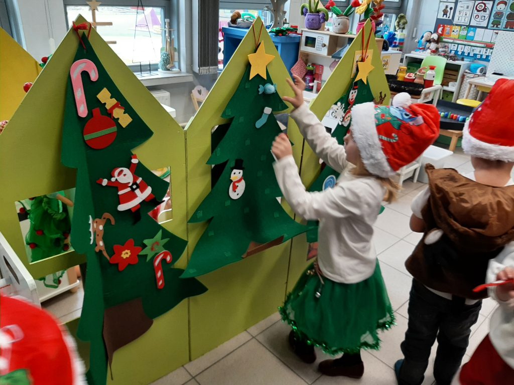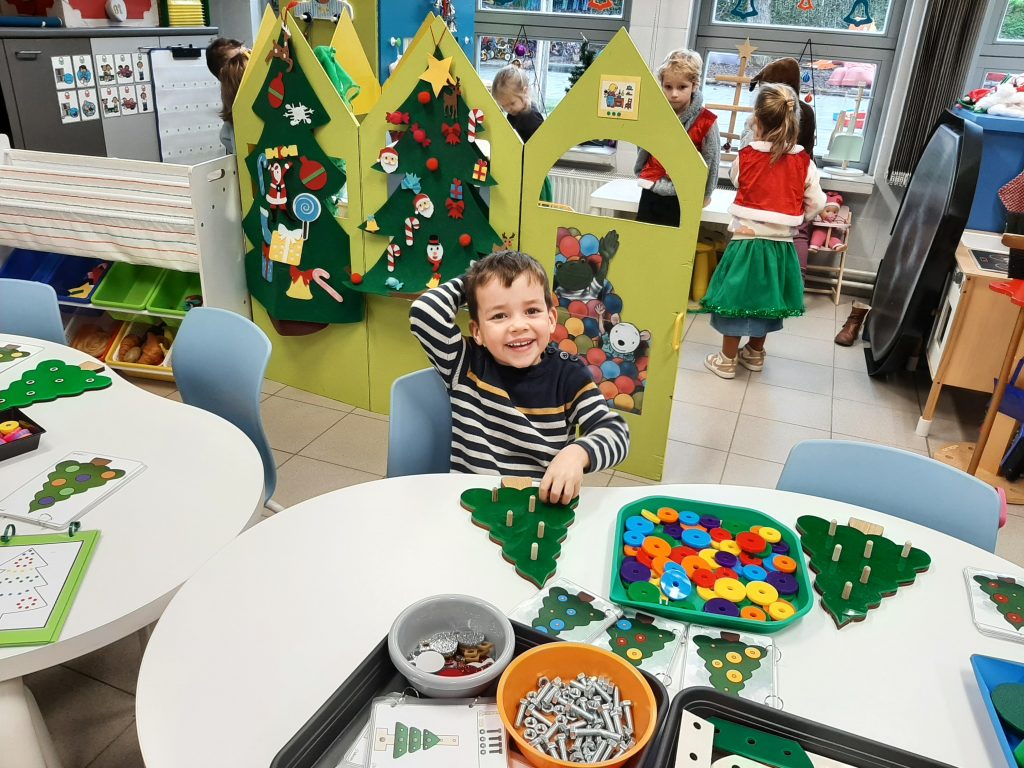 Onze hoeken werden aangepast: in de huishoek konden we verschillende kerstbomen versieren en ook aan de tafel konden we met allerlei materialen kerstbomen versieren.