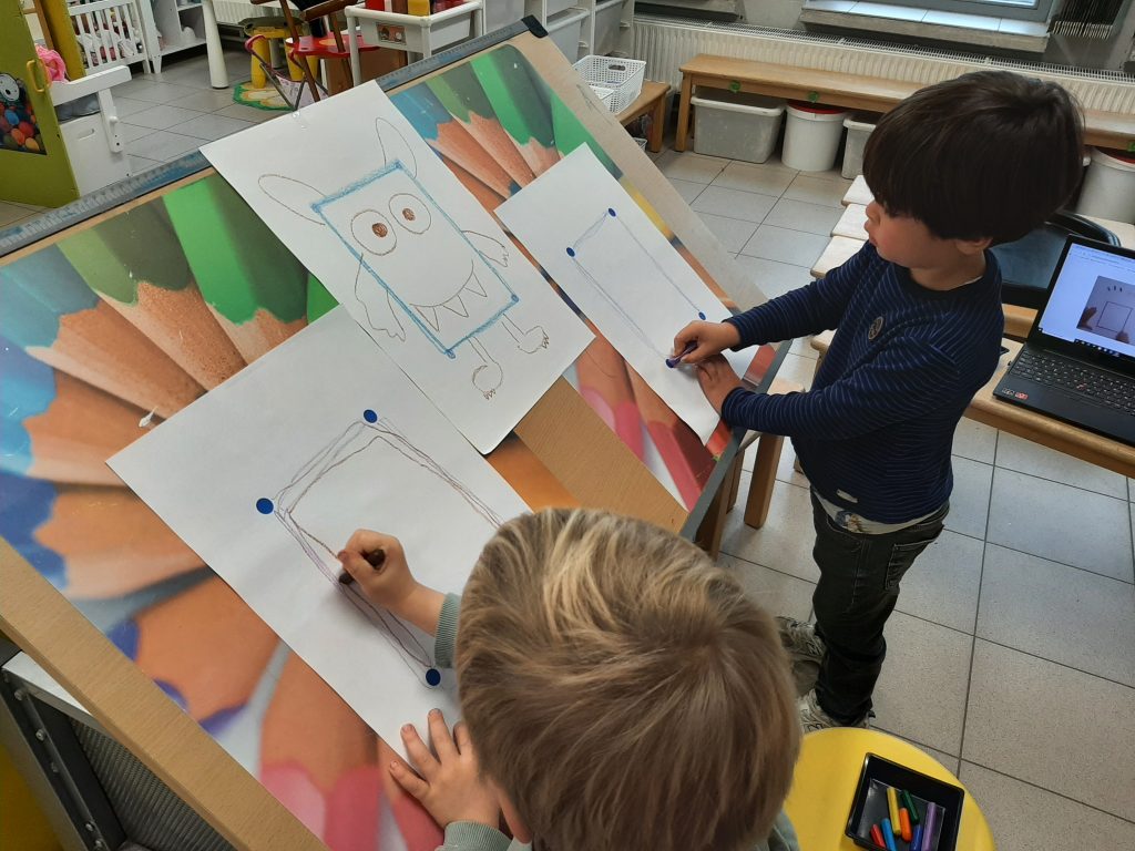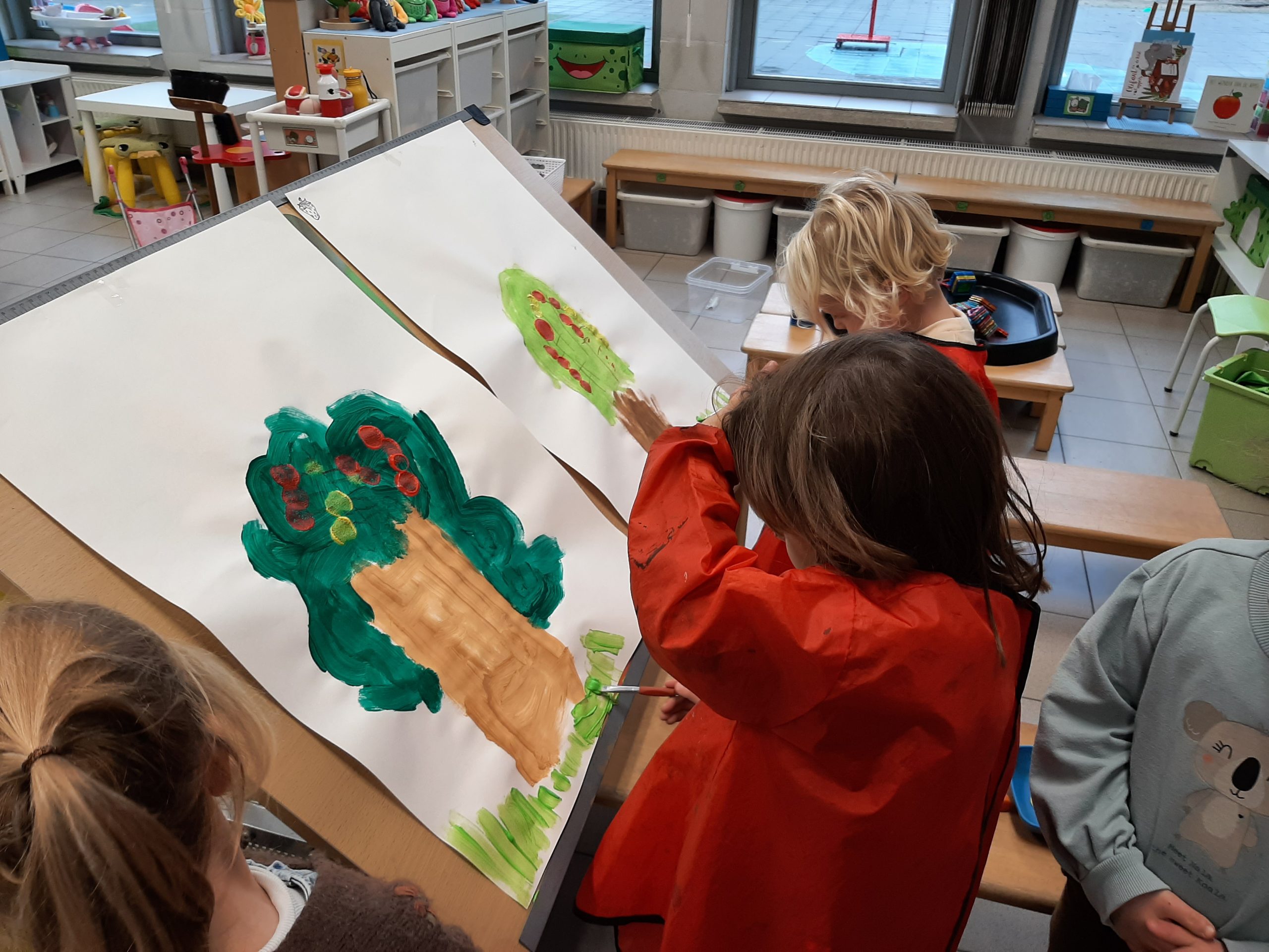Wat gingen van start met het schilderen van een appelboom aan de hand van het liedje “Vele appels aan de bomen!”.