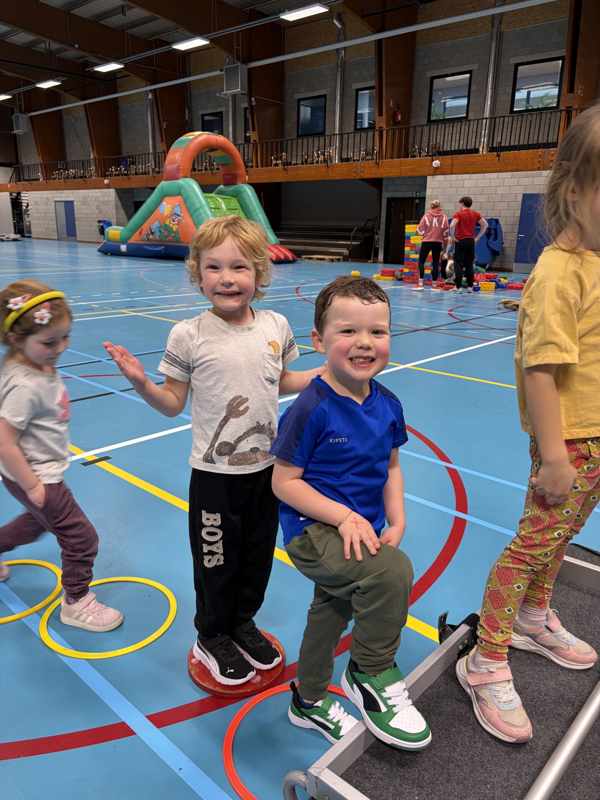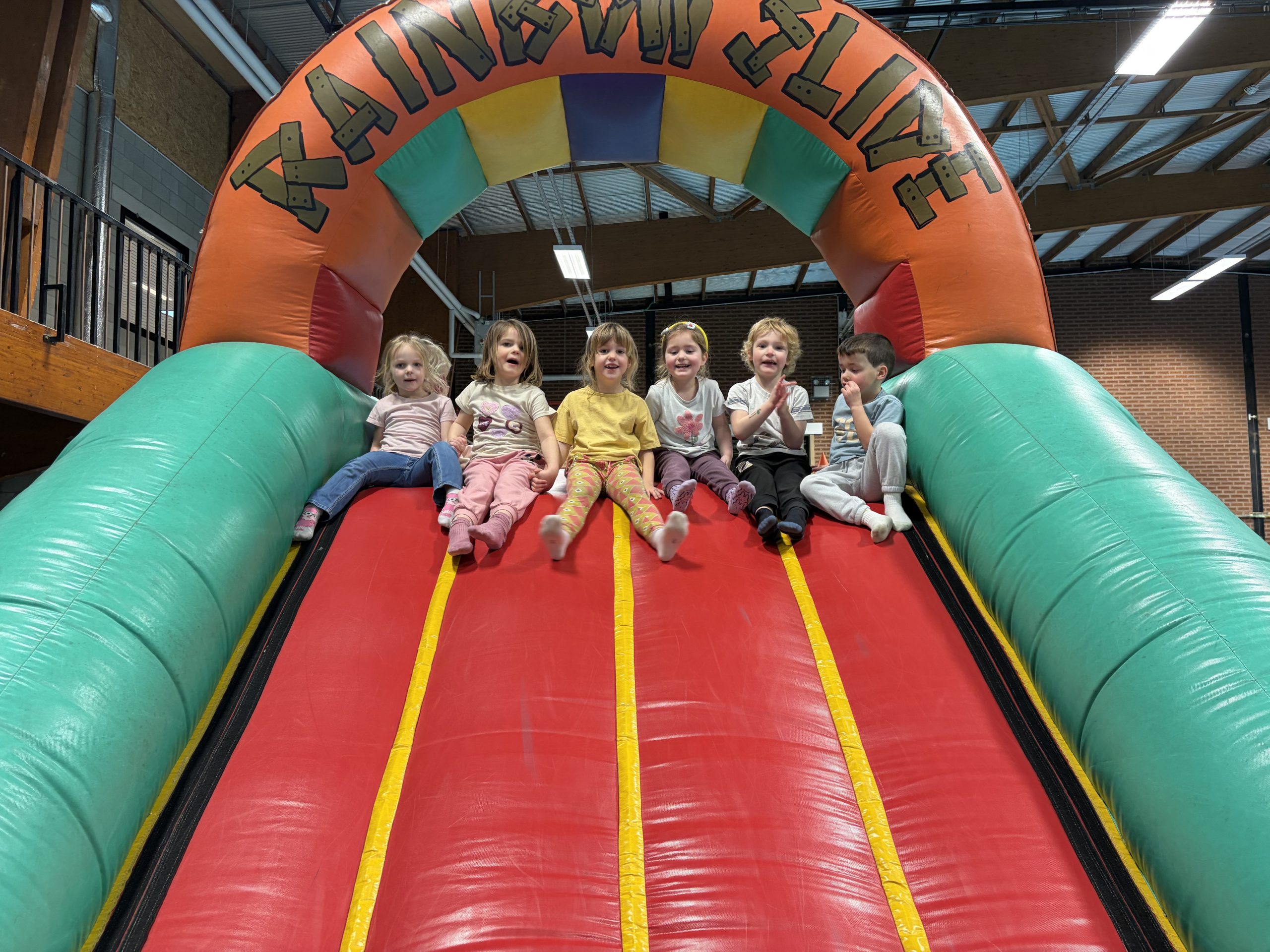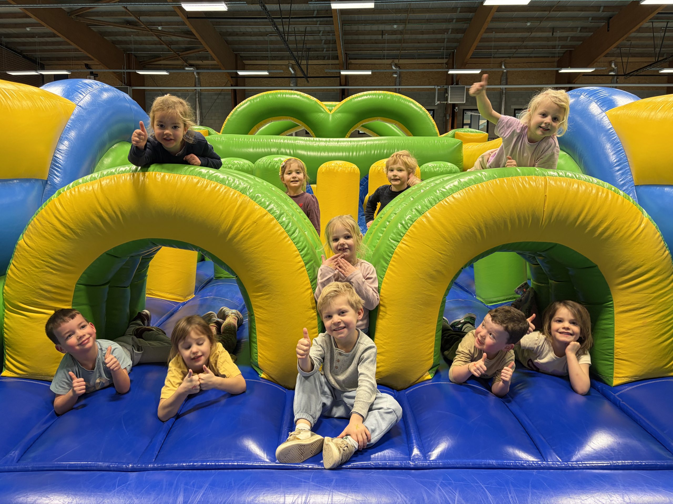 We konden ons uitleven op de springkastelen, legden allerlei parcours af, sprongen op de grote trampoline, speelden in het ballenbad en sloten af met de fietsen.